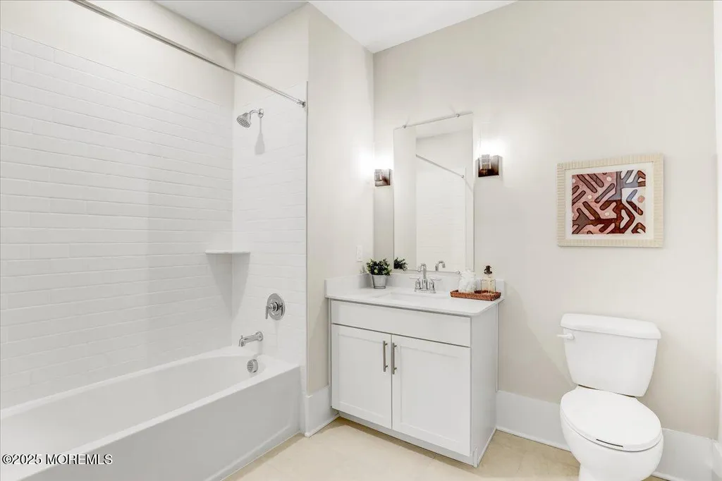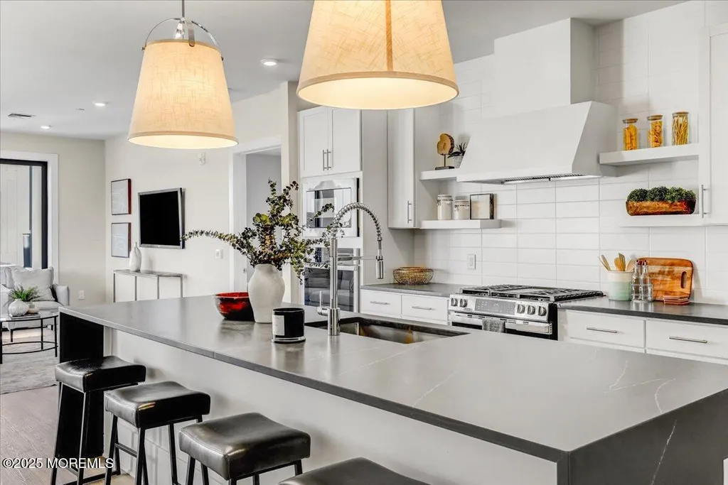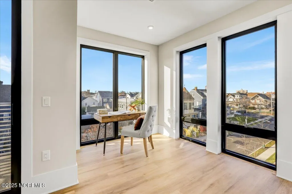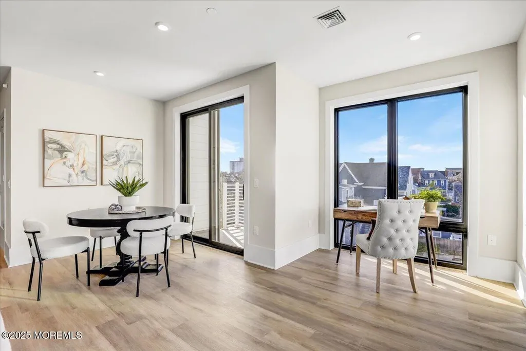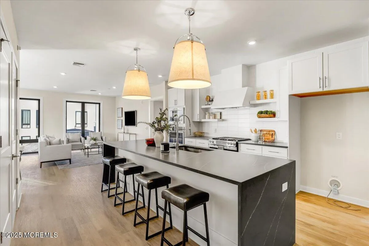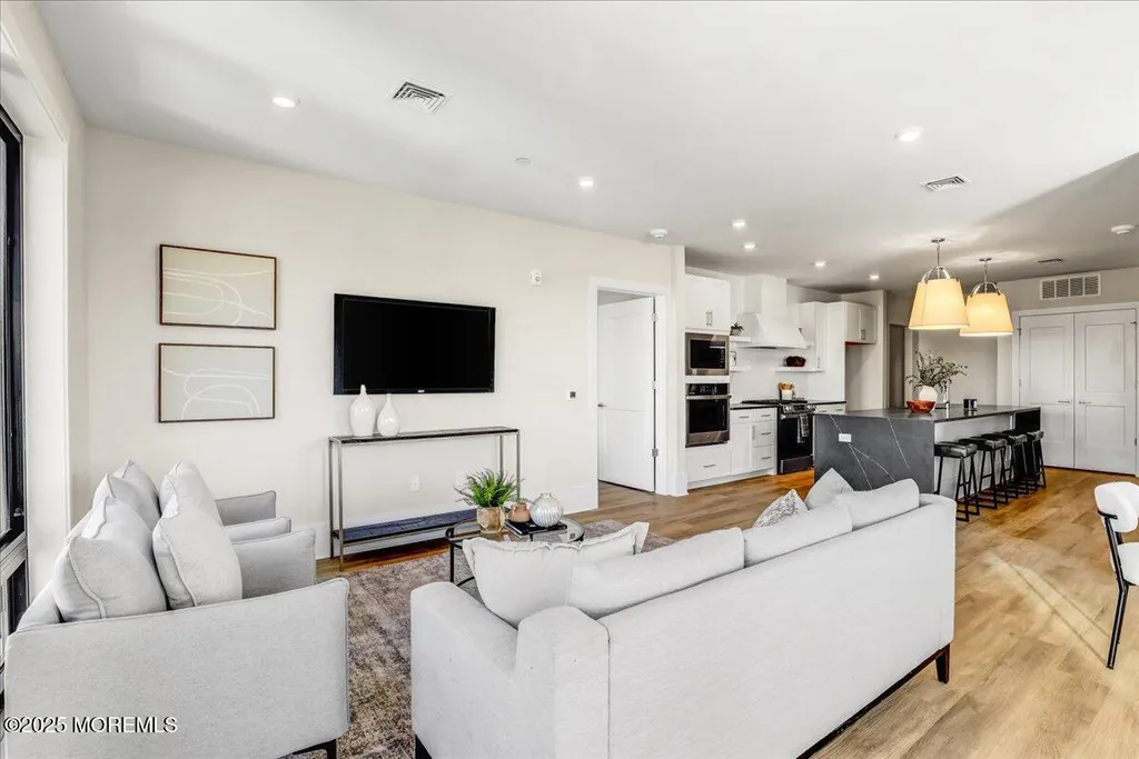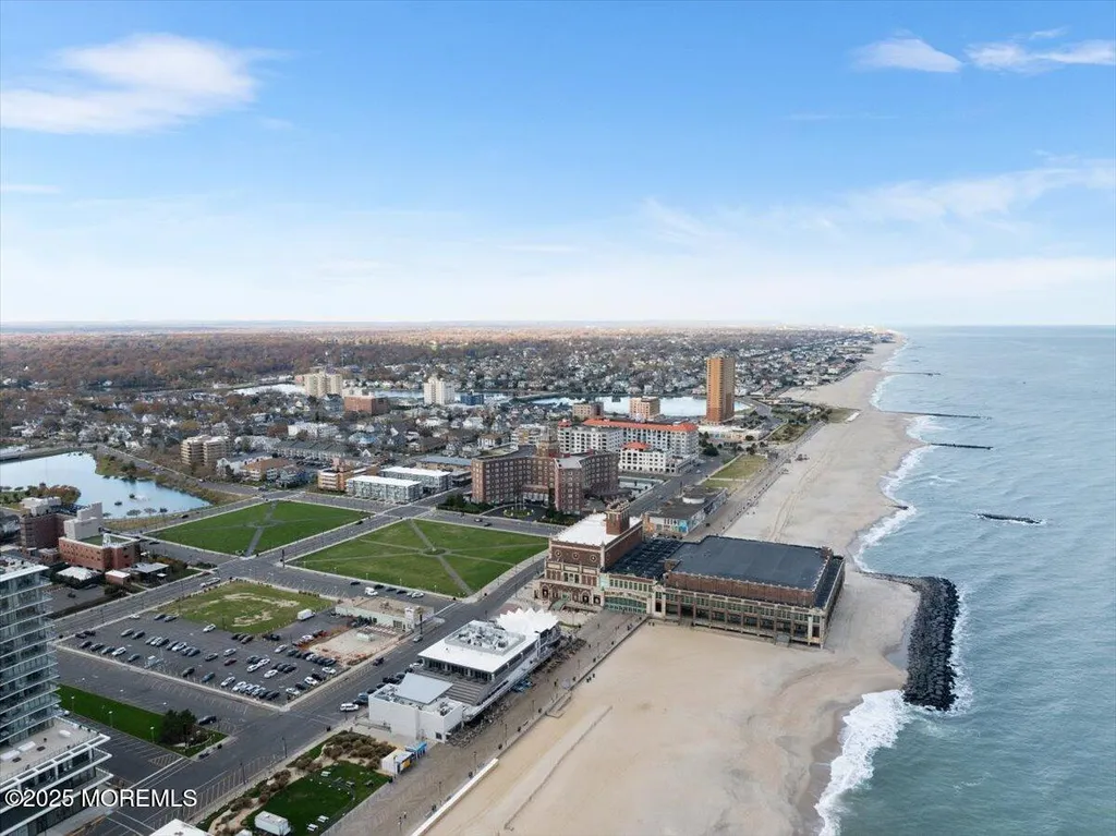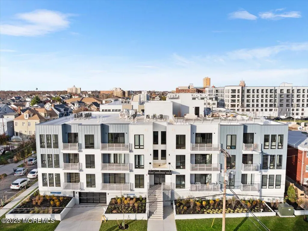 Greetings from Asbury Park! Your beach town luxury escape awaits. At over 1200 SF and just finished, this gorgeous two bedroom two bath condo in the brand new super desirable ''The Aegean'' building is a must-see. Just 2 short blocks to the beach and a few steps to Asbury's restaurants, music, galleries, and nightlife. The premium top floor corner location in this elevator building offers stunning views through the floor to ceiling Pella windows. The open concept and soaring loft style ceilings add to the elegance. A private balcony off the massive living area looks out onto a park-like lot. The luxury upgraded kitchen features stainless steel appliances, quartz countertops with an oversized waterfall island, full height subway tile backsplash, and floating shelves flanking a beautiful oversized hood. The spacious primary bedroom features a huge walk in closet and a spa like private bath. A tankless water heater adds to the high-end amenities. A deeded parking space in the indoor garage adds to the value. Owners will have access to a bike room and luxurious rooftop deck with barbecues, couches, and breathtaking ocean views. Don't let this one get away.